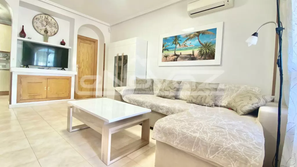 Cozy renovated 2 bedroom apartment overlooking the park, with an incredible location in a quiet street but at the same time in the heart of La Zenia close to the supermarket and famous restaurants and pubs. 2 bedrooms with new furniture in the style of Scandinavian minimalism and built-in wardrobes, a bathroom with a bathtub, a living room with furniture and TV with access to a terrace overlooking the park and a side sea view, a functional kitchen with furniture and household appliances (induction hob, oven wardrobe, refrigerator, boiler, washing machine), heating radiators for heating in the cold season, utility room. The apartments are located in a closed urbanization with beautiful gardens, communal swimming pools for adults and children and a barbecue area. The wonderful atmosphere and gentle climate of La Zenia allows you to sunbathe all year round, relax on the beach and indulge in all kinds of water sports. This is an ideal place for both recreation and living all year round. The region has all kinds of services and entertainment: a variety of bars, restaurants, supermarkets, shopping centers, including the famous LaZenia Boulevard, schools, medical centers, the best golf courses, tennis and paddle tennis courts. Less than an hour away are international airports, water and amusement parks, zoos, landscaped parks, conservation areas and salt lakes.