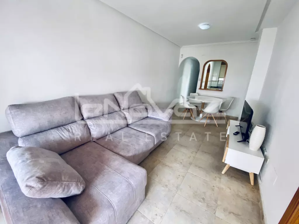 Cozy apartment with a living room, bedroom, bathroom. With furniture and appliances. Fully furnished apartment, ready to move in. Layout: spacious living room with a seating area and dining table, separate bedroom with a large wardrobe and a double bed. Furniture: modern corner sofa, TV, dining table with chairs, bedside tables, spacious wardrobe, bed with soft headboard. Interior: fresh cosmetic renovation, light colors, tiled floor. Equipment: TV, fan, mirrors, cabinets, floor dryer, ironing board. Additionally: glazed balcony/loggia with sun protection awnings, lots of natural light, quiet area. An excellent option for those looking for ready-made housing without additional investments.