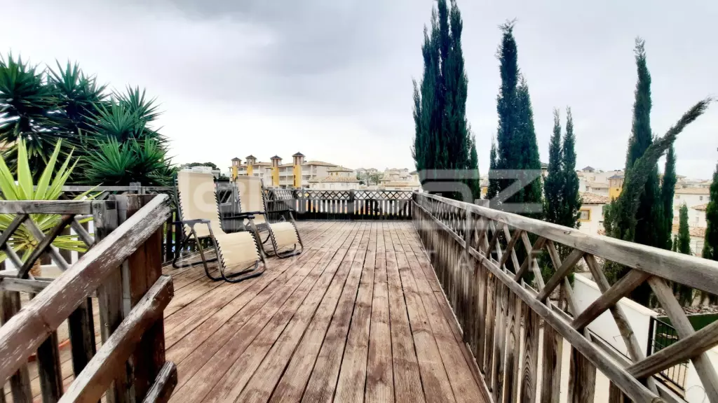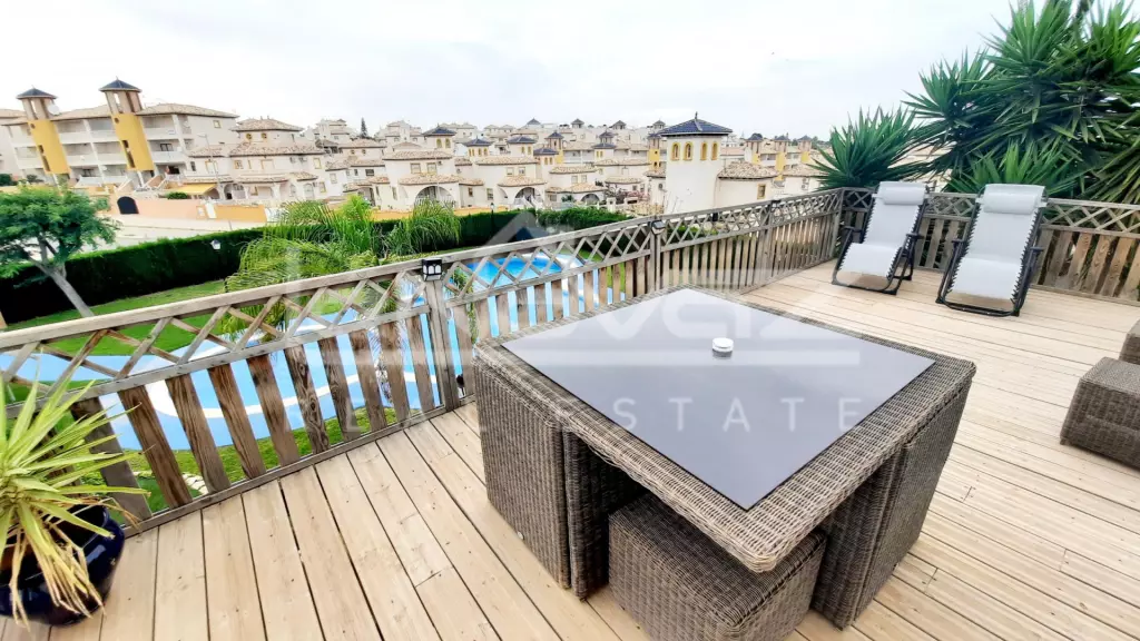 Exquisite 5 bedroom villa with large garden, private pool and solarium with sea views in Lomas de Cabo Roig. The interior decoration of the villa is thought out to the smallest detail. 5 bedrooms with furniture in the best traditions of the classical style. 3 complete bathrooms. The villa is accessed through an electric gate or a separate entrance to the spacious living-dining room, which offers a magnificent view of the pool. Separate modern kitchen. Covered terrace. On the same level is the bedroom, which is currently used as an office. One of 3 bathrooms with shower. A marble staircase leads to 2 large bedrooms, both of which have access to a large terrace that surrounds the front of the house and offers fantastic sea views, as well as a family bathroom with a large round bathtub. Additional 2 bedrooms, one of which has a bathroom with shower. Second living room, games room and gym. Patio doors lead to the garden with various seating areas both in the shade and in the sun. Wooden solarium for sunbathing, barbecue and entertainment. Several storerooms. Air conditioning system. High level security and alarm system. Electric blinds. Private pool! Magnificent private garden. The villa is located in a closed urbanization with a communal swimming pool.