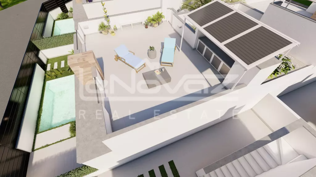 It is a luxury complex of single-family homes with a private pool, terrace and solarium areas that allow you to enjoy all hours of sunshine, every day of the year. Each house has 2 or 3 bedrooms and 2 full bathrooms. The house has been designed on one or two levels, depending on the number of bedrooms, with a contemporary style and an open house concept, which is made up of a fitted kitchen and a living-dining room. The promotion is located in Murcia, within a new gated community with security control in a partial plan of 300,000 m2, surrounded by all services, sports areas and several golf courses. The house has the highest quality standards and is equipped with: Private pool with pre-installation for heat pump and outdoor solar shower. Fully furnished and equipped kitchen with oven, microwave, refrigerator, built-in dishwasher and extractor fan. In addition, central wooden island. Lighting: LED inside the house as well as in outdoor areas. Cabinets lined with drawers. Fully equipped bathrooms with furniture, sink, mirror with light, screens, wall-hung toilet and shower with "rain" sprayer. Summer kitchen in solarium. Pre-installed air conditioning ducts. Parking space within the plot.