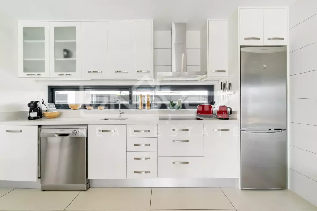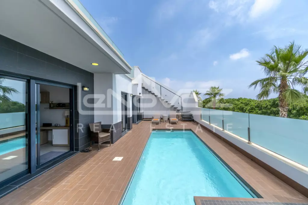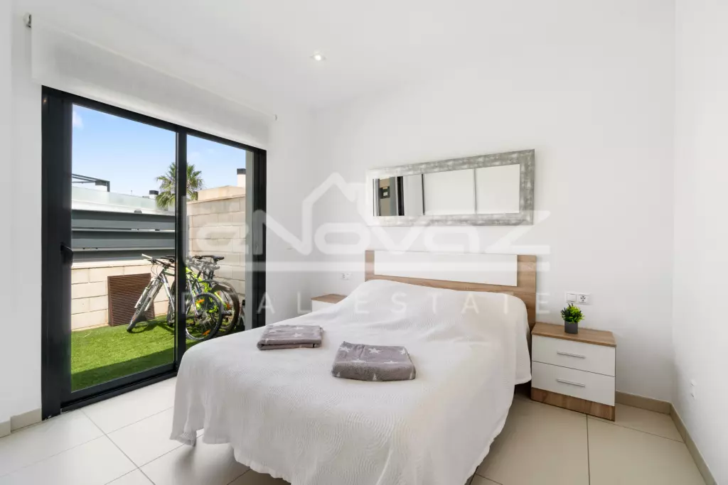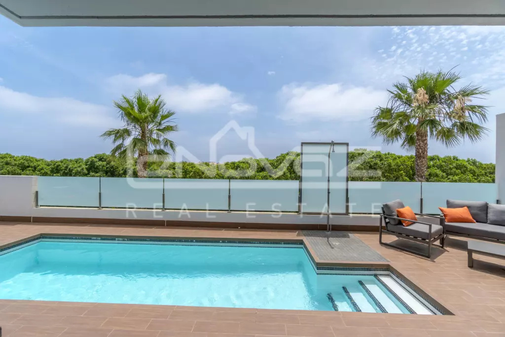 In Lomas de Cabo Roig this charming villa is absolutely new, with three bedrooms, two bathrooms, living room with open kitchen and the plot, one of the two largest in the entire area, very cozy. At the front there is space to park your car, while at the rear there is a large private pool area and outdoor shower. It also has a private roof terrace of 84 m2 with views of the area and the sea. There is also a storage room and Jacuzzi In the garden you also have a covered terrace with barbecue. The house is sold fully furnished and with appliances, there is air conditioning installed in all rooms, and underfloor heating in the bathrooms, the pool is also heated. Lomas de Cabo Roig is an expansive area and has all the services such as restaurants, bars and grocery stores. In 5-10 minutes by car you can reach 4 high-quality golf courses, several beaches and the largest shopping center on the coast, La Zenia Boulevard.