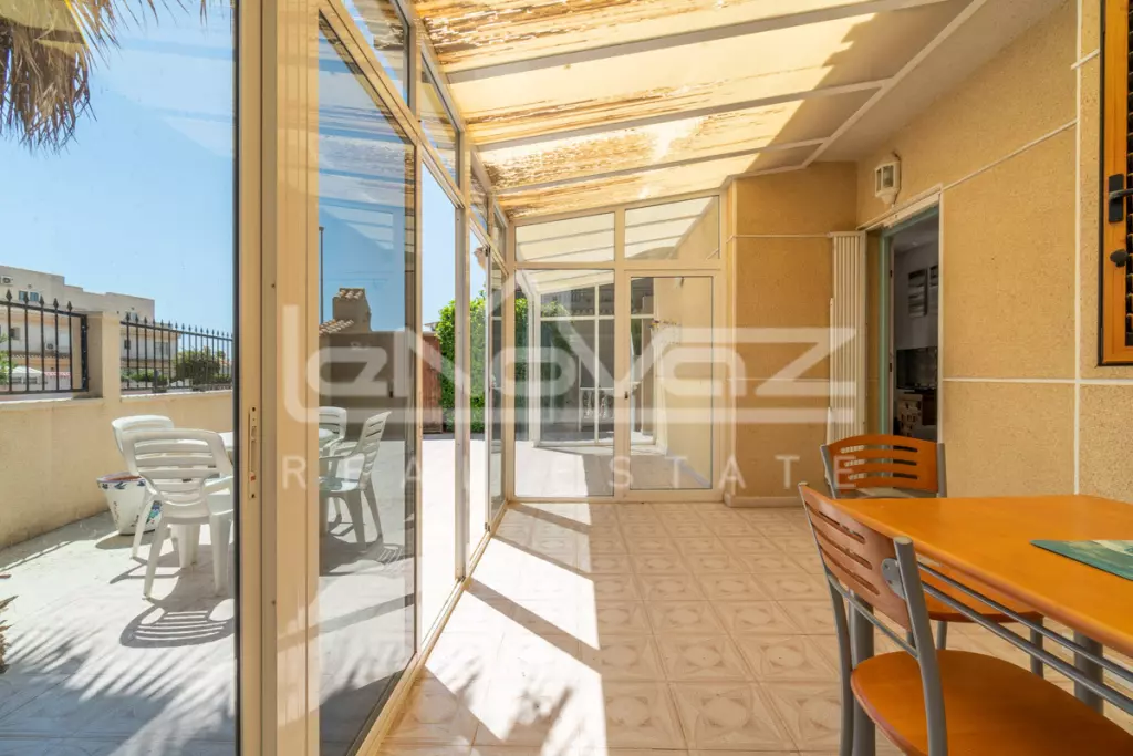 En el corazón de Playa Flamenca, a muy escasa distancia del centro comercial Zenia Boulevard, de las zonas deportivas municipales, del mercadillo del sábado, de zonas de ocio y las mejores playas de Orihuela Costa, se encuentra este duplex adosado de esquina en muy buen estado y listo para entrar a vivir en él, con vistas despejadas, sol todo el día y acceso a los jardines comunitarios y a la gran piscina olímpica del complejo.
