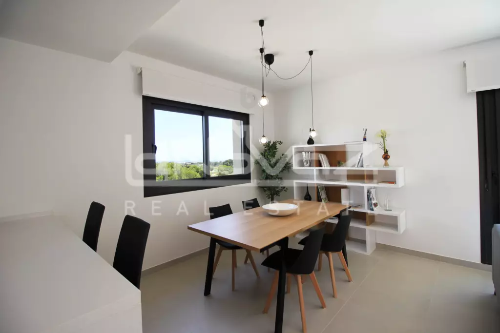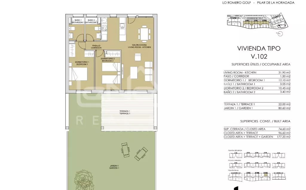 Precioso piso de 2 dormitorios y terraza muy amplia (22 m2) y jardín junto a los mejores campos de golf esmeralda de Pilar de la Horadada desde 234.900 EURO. 2 dormitorios con muebles modernos y armarios empotrados. 2 baños equipados. Amplio salón luminoso con acceso a una gran terraza (22 m2) con impresionantes vistas panorámicas de las infinitas extensiones de campos de golf. Cocina americana con muebles y todos los electrodomésticos necesarios. Se ofrece un lugar en el estacionamiento cubierto a un costo de 5,000 EURO.