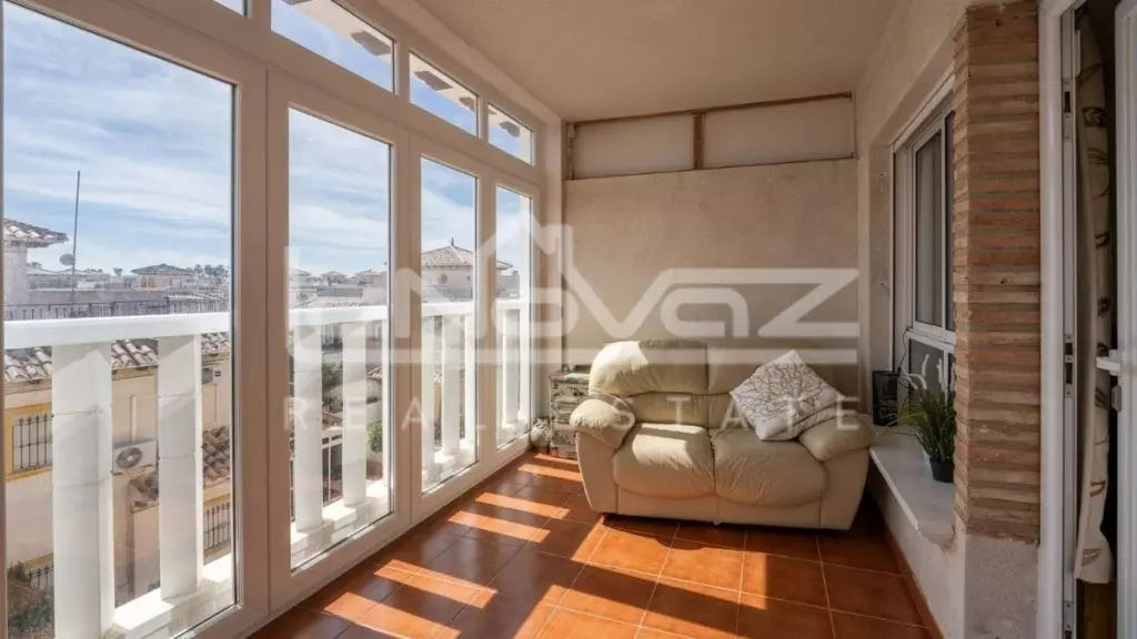 Піднімаючись по сходах на 2-й поверх, ви побачите вхід до квартири в пентхаусі, який веде прямо на великий сонячний балкон, закритий потрійними склопакетами, що означає, що в зимові місяці ви можете насолоджуватися теплом зимового сонця. при зачинених дверях. Влітку двері повністю закриваються, створюючи прохолодний вітерець.