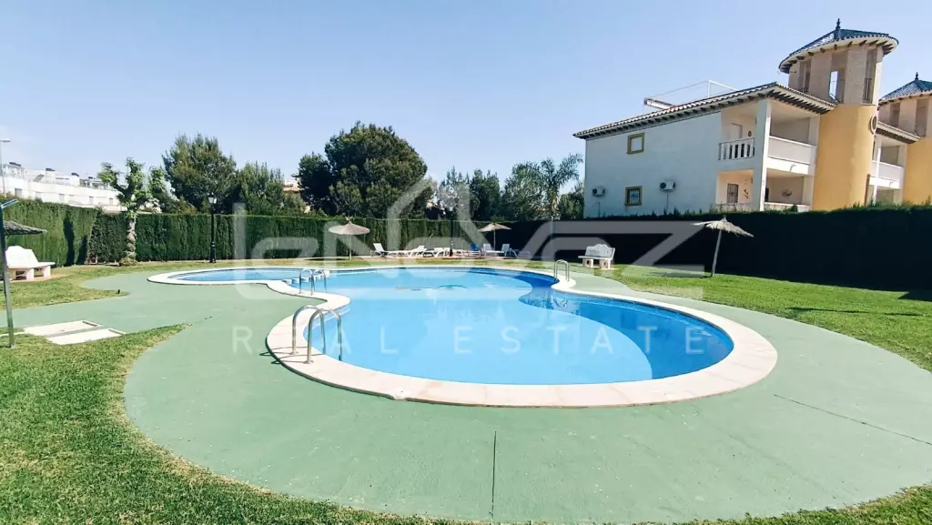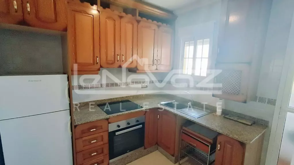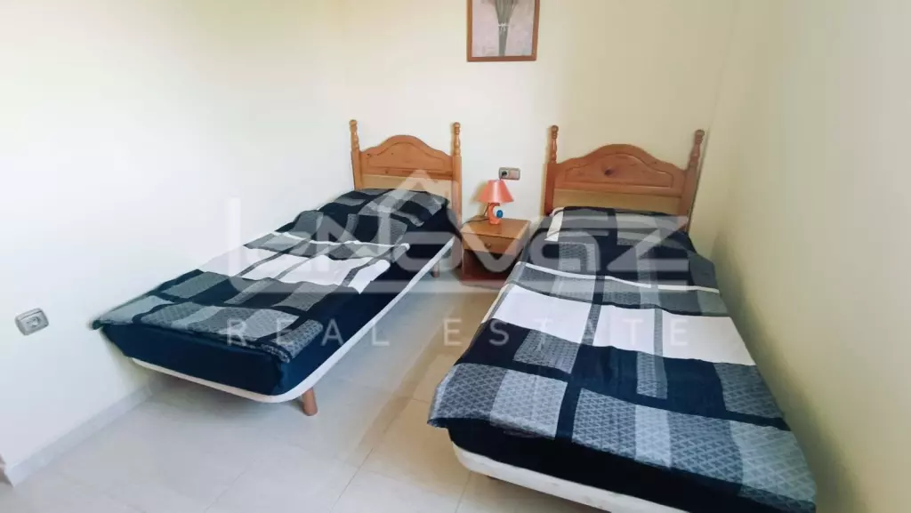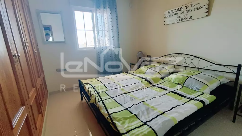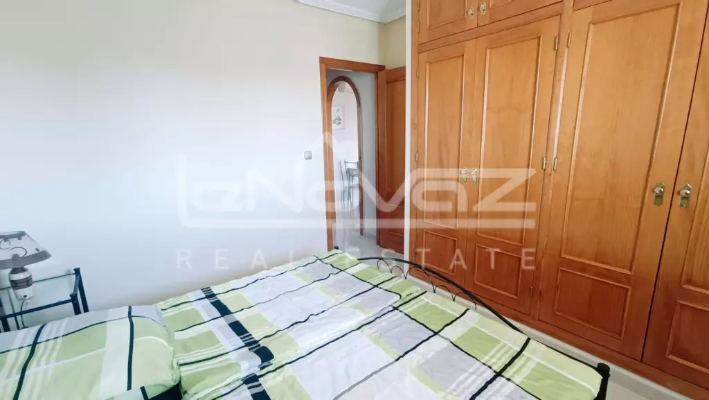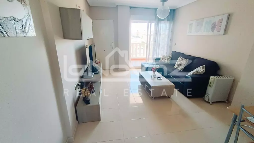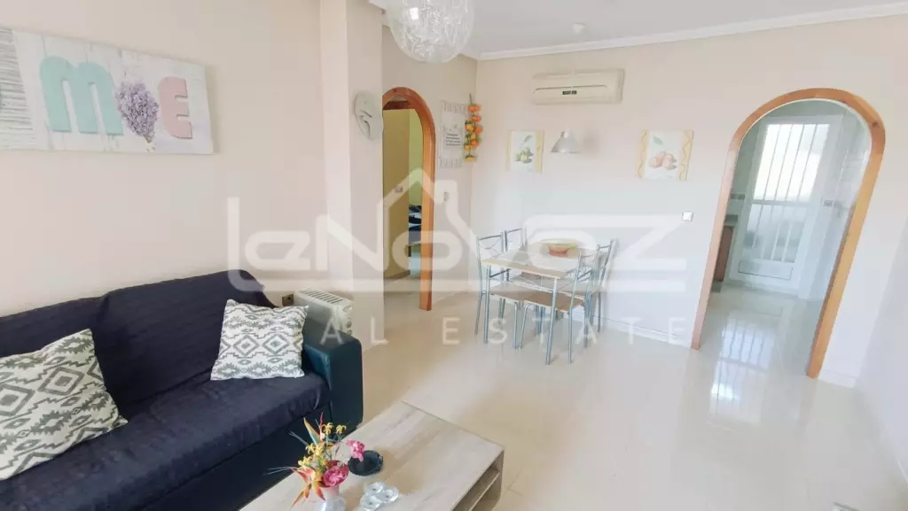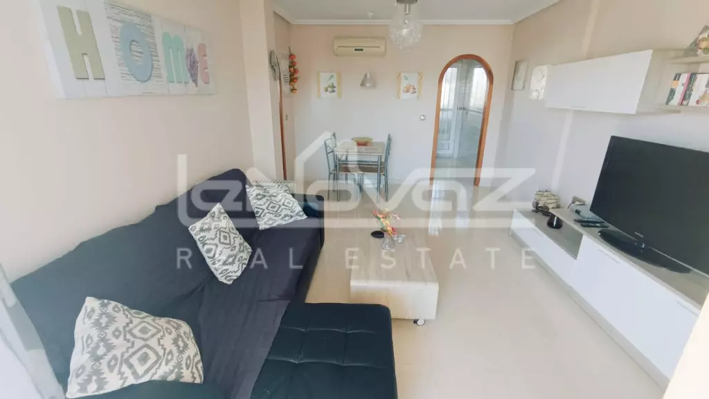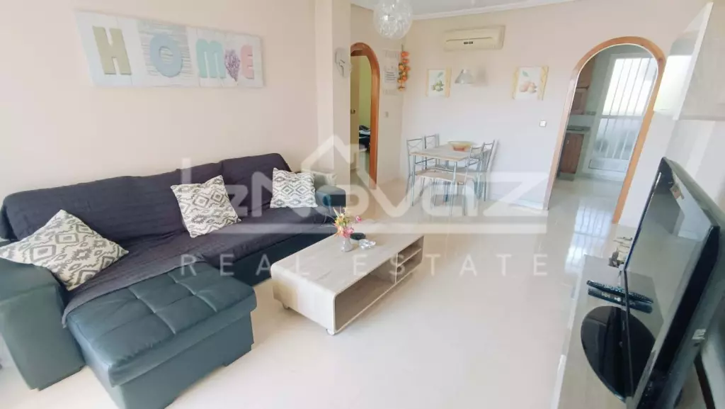 Перед будинком є приватна парковка для мешканців, що забезпечує додаткову безпеку. Квартира розташована на 2-му поверсі, на який можна піднятися по сходах і виходить на південь. Ви потрапляєте безпосередньо у світлу та простору вітальню-їдальню відкритого планування, яка оснащена кондиціонером для гарячого та холодного повітря. Нерухомість продається з меблями, а у вітальні є двоспальний диван-ліжко, коли друзі та родина приїжджають погостювати, або це чудове помешкання для оренди.